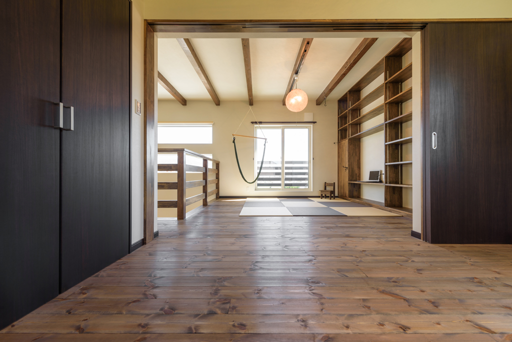 2Fフリースペースに繋がる夫婦寝室。3枚の引き戸でオープンな空間に。
